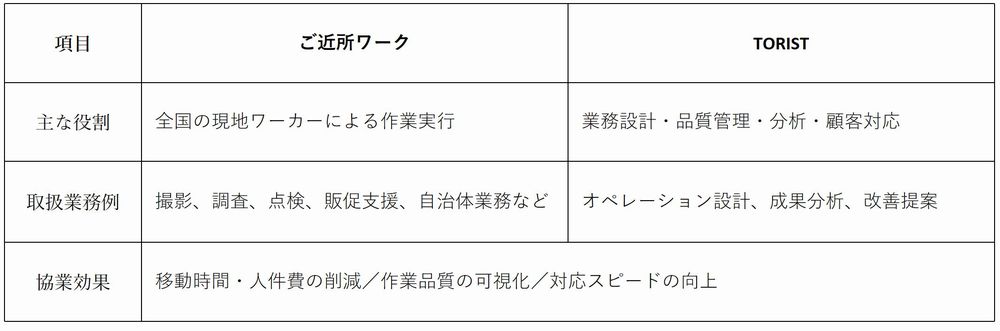 業務BPO・DX支援を行う 株式会社TORIST(本社:名古屋市/代表取締役:久野真之介)と、全国の地域住民による現地作業マッチングプラットフォームを展開する ご近所ワーク株式会社(本社:東京都港区/代表取締役:中村浩史・オープングループ株式会社〔東証プライム:6572〕のグループ会社)は、地域現場業務の効率化・品質向上を目的とした業務協業を開始いたしました。